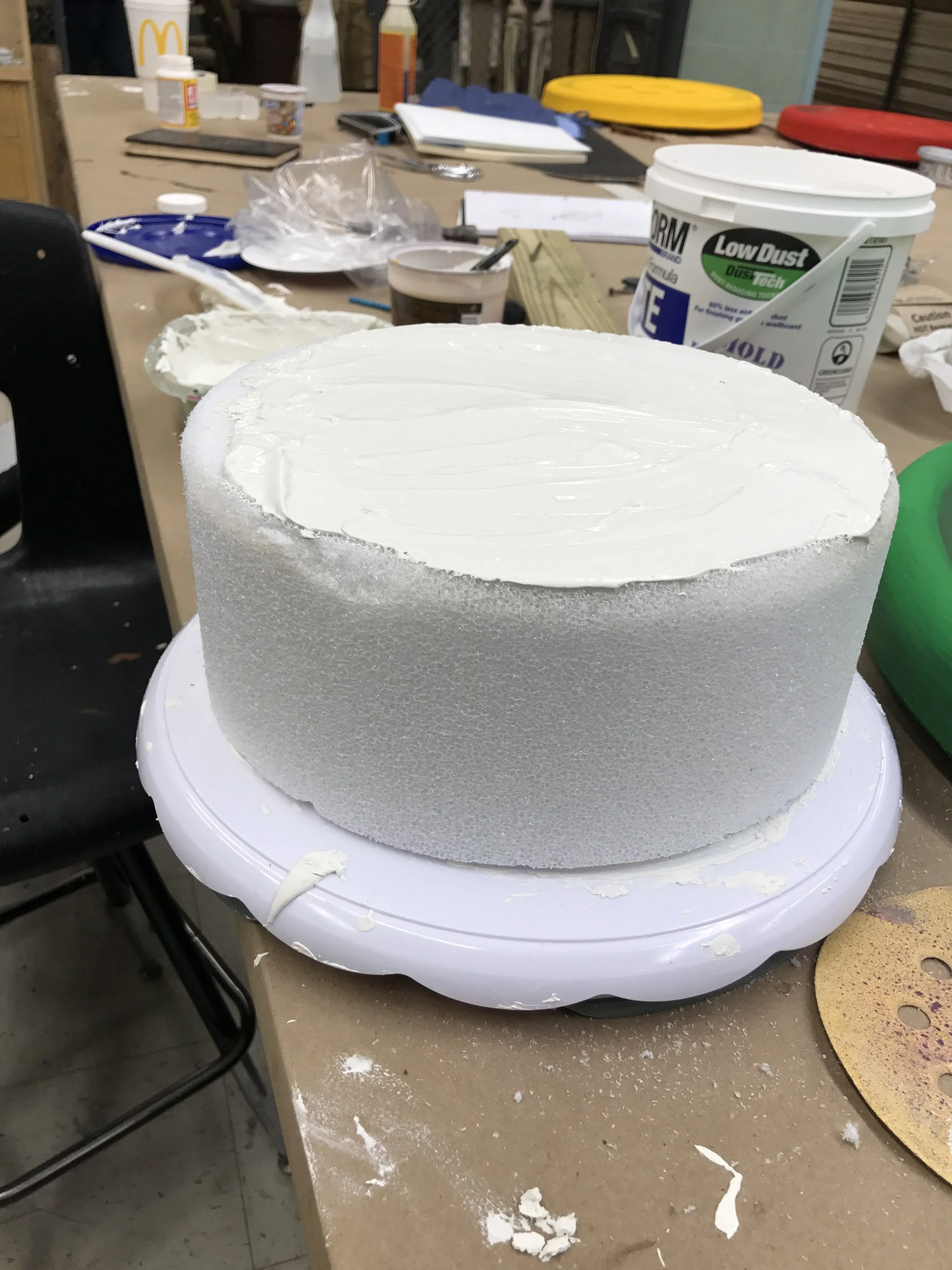 Styrofoam cake form, coated in joint compound. Sanded and finished with matte Mod Podge. Piping done with mixture of joint compound and acrylic craft paint. “Fondant” numbers made with Model Magic, painted to match.