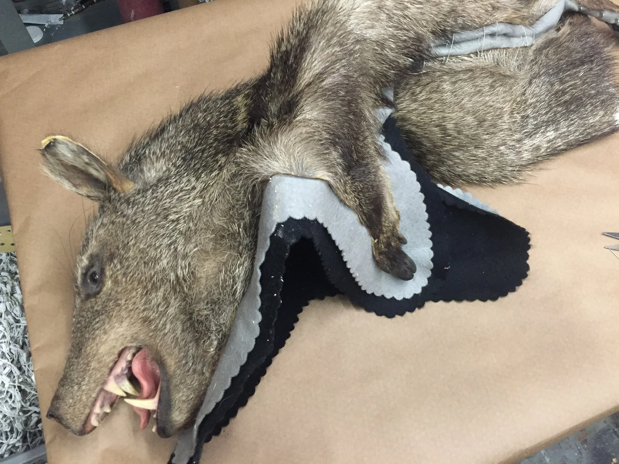 Wild boar taxidermy pelt, shape formed with foam “ribs” to allow for comfortable shoulder-carry by actor. Trimmed & stitched closed. Seam line & foam form masked with faux fur, trimmed and painted to match original pelt.