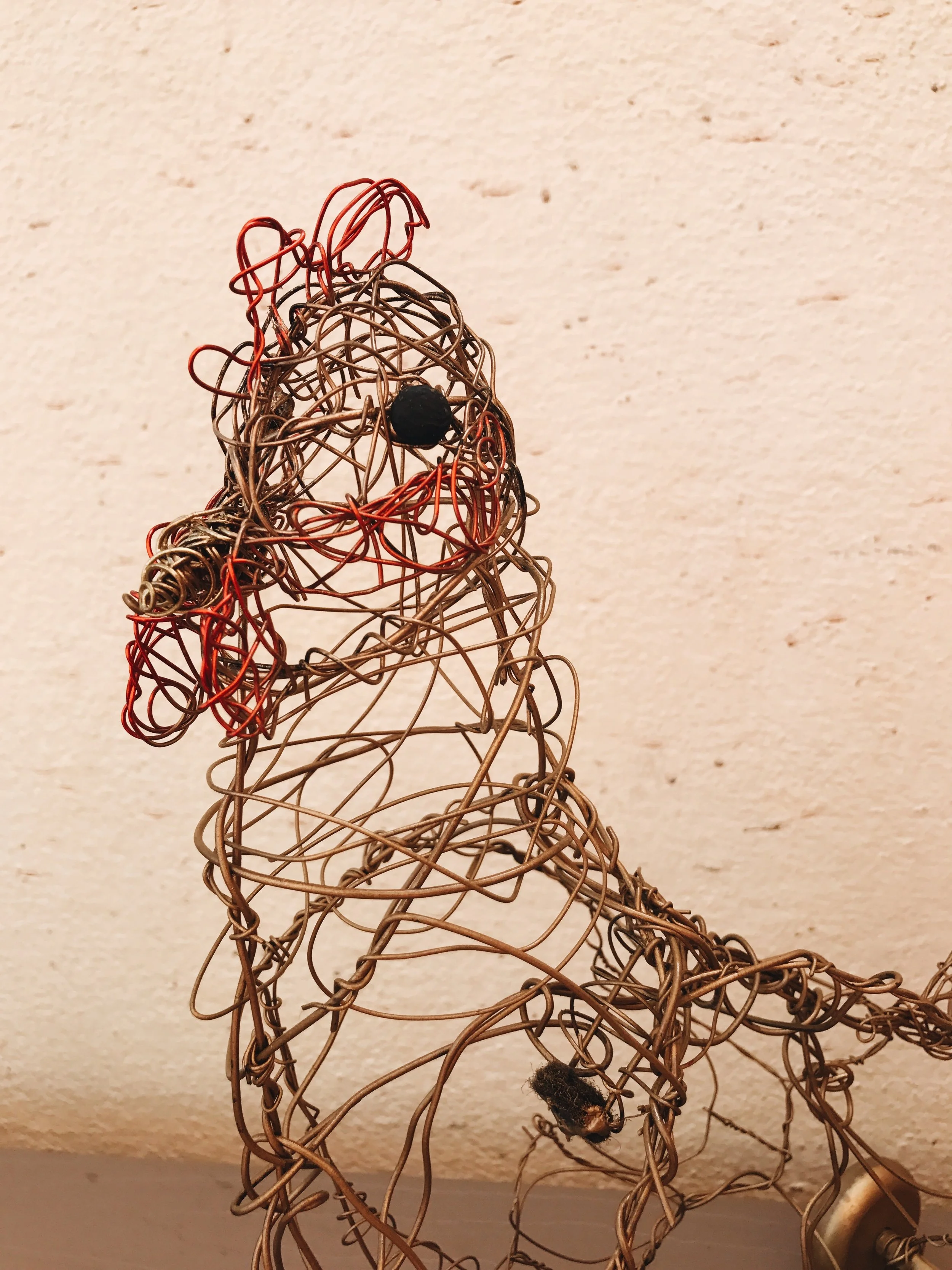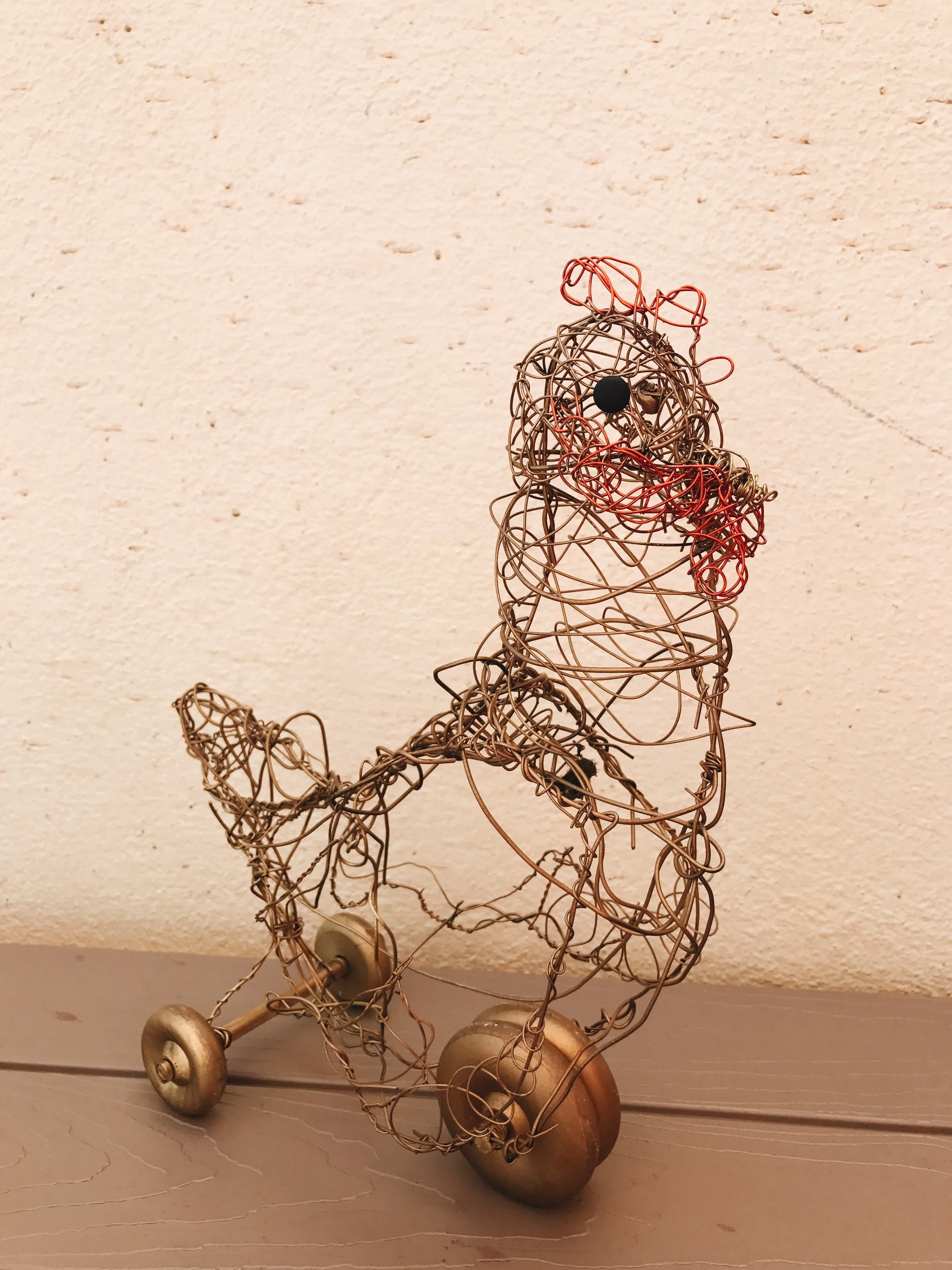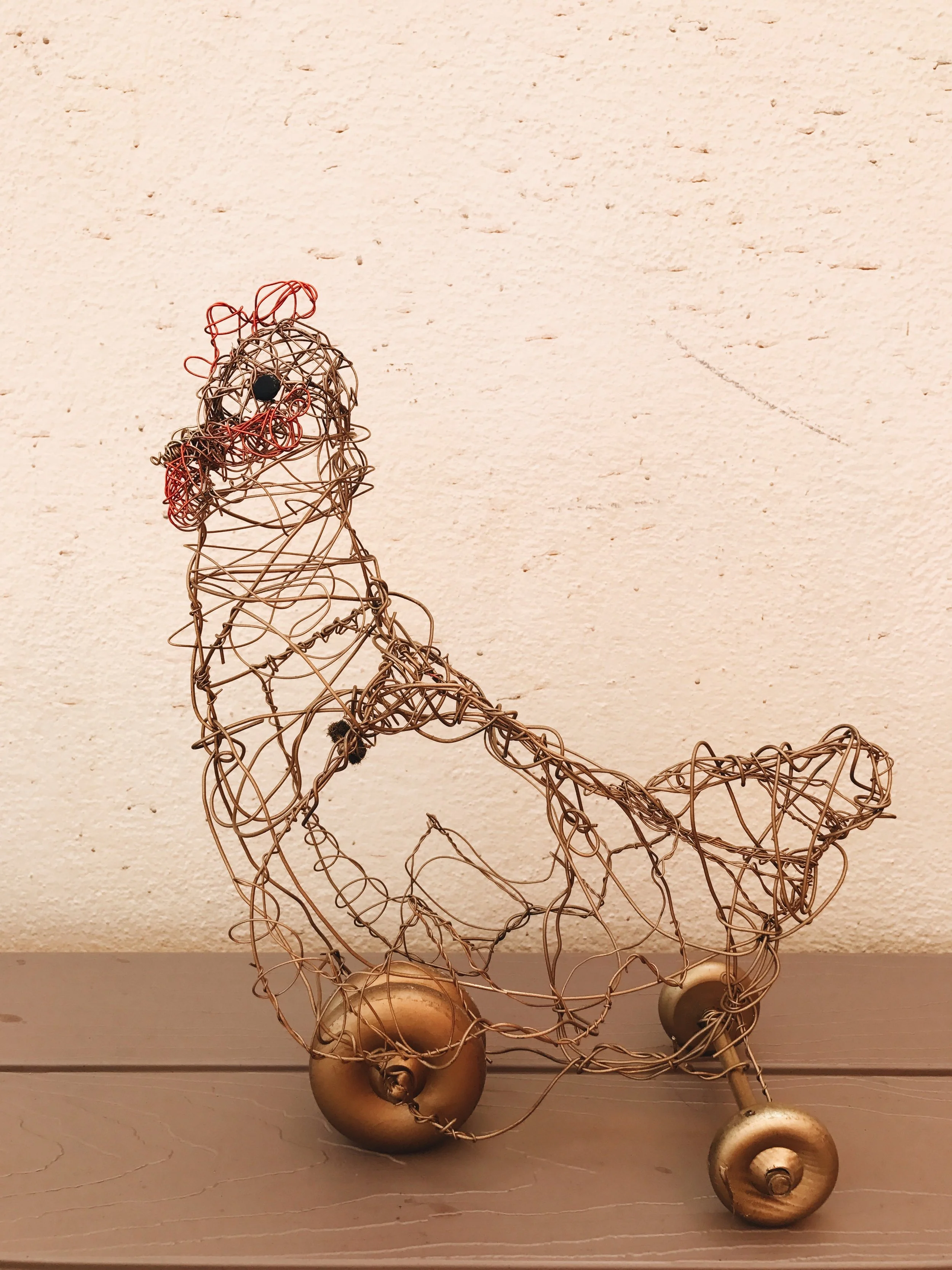 Freehand wire sculpture. Structured outline with baling wire, detail created with varying gauges of jewelry wire. Painted with metallic spray and craft paint. Pushed by dowel rod, inserted in puppet’s “shoulder”.