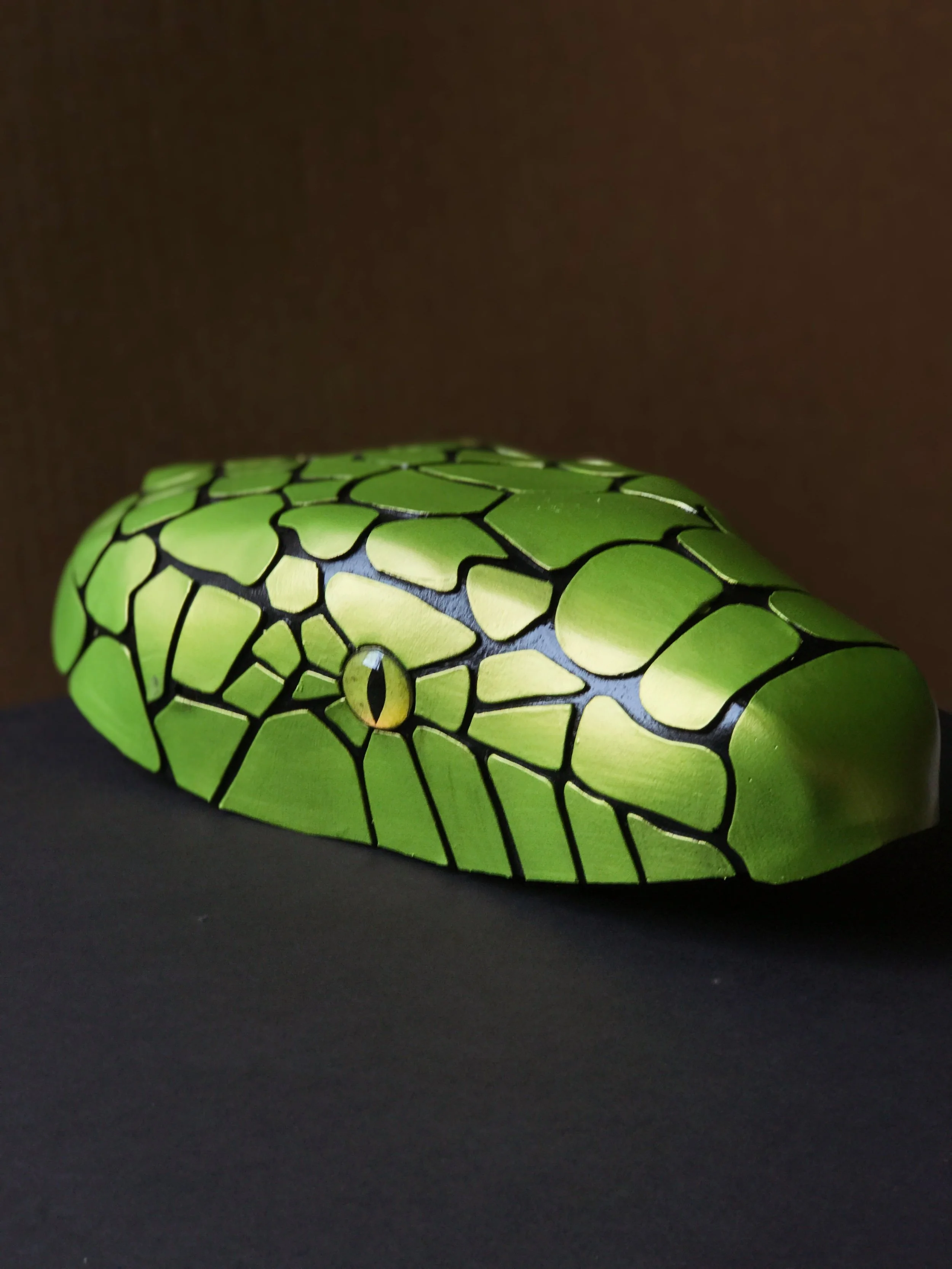 Hand puppet, completed as part of independent study in puppetry. Original structure & scale pattern designed by me. Constructed using EVA cosplay 1/4” foam and Barge cement. Painted with black Plastidip for texture, and green color-shift acrylic craft paint. Eye made with color shift paint, adhered to small glass cabochon.